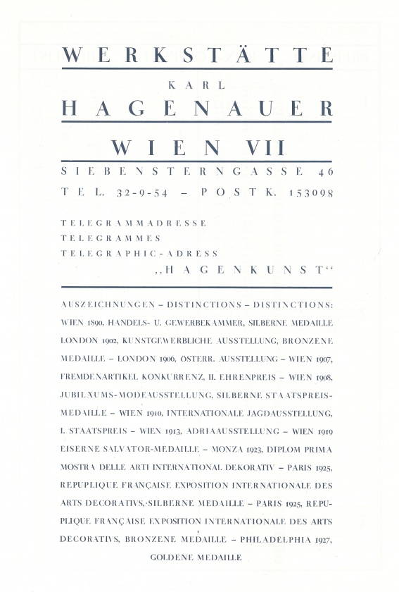Die Telegrammadresse "Hagenkunst" der Werkstätte Hagenauer in Wien VII im Jahr 1928 gibt einen ersten Hinweis auf das Selbstverständnis dieses 1898 gegründeten Betriebes mit Spezialisierung auf Metallprodukte. Unter Karl Hagenauer (1898-1956), dem Sohn des Firmengründers, der an der Kunstgewerbeschule bei Josef Hoffmann und im Umkreis der Wiener Werkstätte studiert hatte, kam es zu einer zeitgemäßen Ausprägung der Produktion.